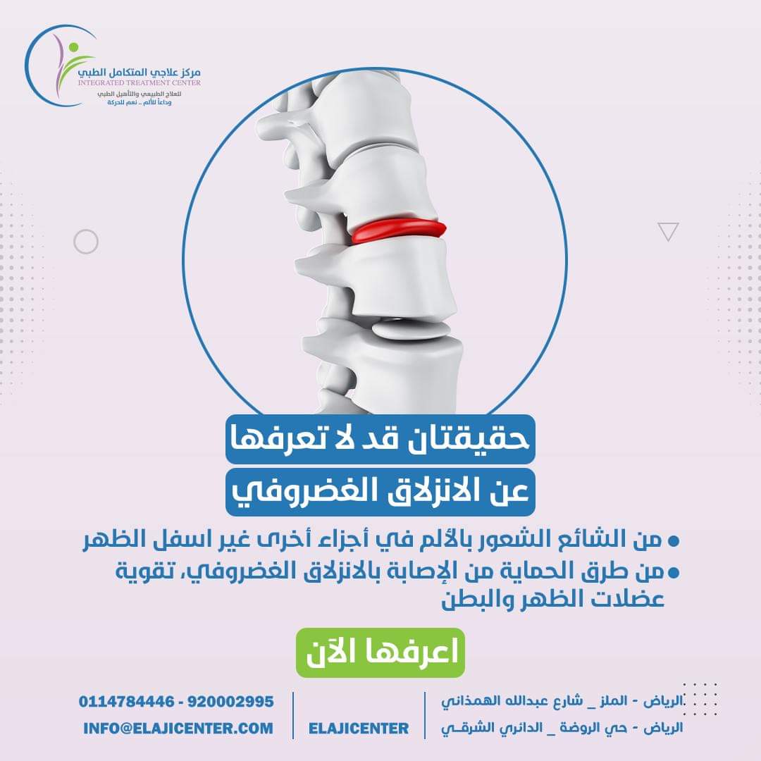 الانزلاق الغضروفي حالة شائعة لكنها قابلة للعلاج والوقاية ومن خلال العناية بصحة العمود الفقري واتباع نصائح الوقاية حيث يمكن تقليل خطر الإصابة وتحسين جودة الحياة وفي مركز علاجي المتكامل نقدم خدمات متكاملة تشمل التشخيص والعلاج المخصص لكل حالة لضمان تحقيق أفضل النتائج الصحية.